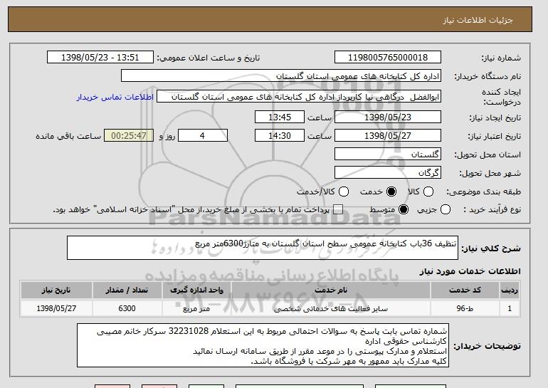 شرح کلی نیاز: تنظیف 36باب کتابخانه عمومی سطح استان گلستان به متارژ6300متر مربع