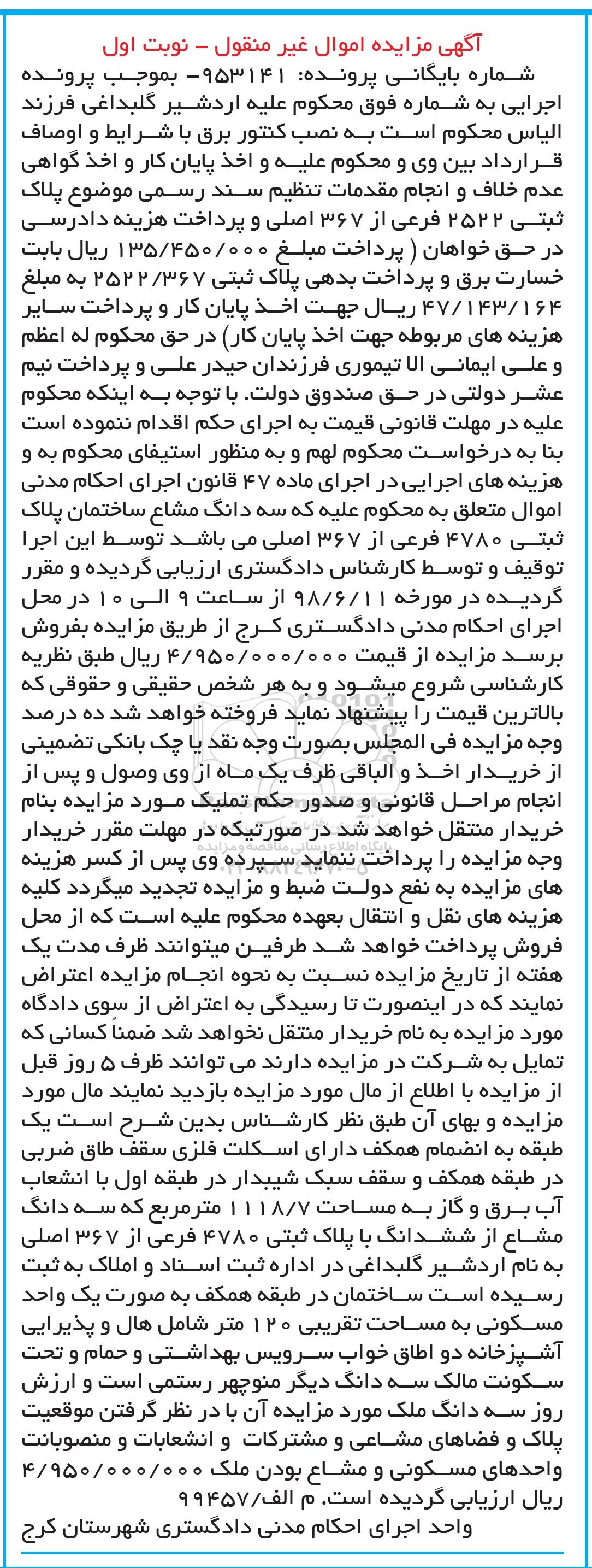 مزایده سه دانگ مشاع ساختمان 1118.7 مترمربع نوبت اول پرونده 953141