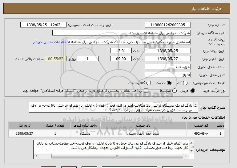 استعلام بارگیری یک دستگاه ترانس 30 مگاولت آمپر در انبار فجر ( اهواز ) و تخلیه به همراه چرخش 90 درجه بر روی تریلر پست موبیل در پست موقت دوم سبز آب اندیمشک . , استعلام بارگیری یک دستگاه ترانس 30 مگاولت آمپر در انبار فجر ( اهواز ) و تخلیه به همراه چرخش 90 درجه بر روی تریلر پست موبیل در پست موقت دوم سبز آب اندیمشک .