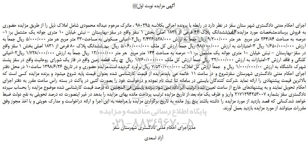 اجرای احکام مدنی دادگستری شهر ستان سقز در نظر دارد در رابطه با پرونده اجرائی بکلاسه 980295 ، ماترک مرحوم عبداله محمودی شامل املاک ذیل را از طریق مزایده حضوری به فروش برساند.مشخصات مورد مزایده: الف:ششدانگ پلاک 46 فرعی از 1831 اصلی بخش 1 سقز واقع در سقز-بهارستان - نبش خیابان 10 متری جوانه یک مشتمل بر: 1- عرصه به مساحت 264/84 متر مربع هر متر 9/200/000 ریال جمعاً به ارزش 2/436/528/000 ریال2-اعیانی مسکونی به مساحت330 متر مربع هر متر 5/000/000 ریال جمعاً به ارزش 1/650/000/000 ریال 3-امتیازات به ارزش 98/000/000 ریال جمعاً ارزش کل ملک 5/060/000/000 ریال ب: ششدانگ پلاک 80 فرعی از 1831 اصلی بخش 1 سقز واقع در سقز-بهارستان - نبش خیابان 10 متری جوانه یک مشتمل بر: 1- عرصه به مساحت 144 متر مربع هر متر 12/000/000 ریال جمعاً به ارزش 1/728/000/000 ریال2-اعیانی کلنگی و فاقد ارزش 3-امتیازات به ارزش 32/000/000 ریال جمعاً ارزش کل ملک 1/760/000/000 ریال ج: یک قطعه زمین واقع در فاز یک شورای روحانیت واقع در سقز پشت شهرک دانشگاه به ارزش 1/000/000/00 ریال و جمعاً ارزش کل املاک 7/520/000/000 ریال برآورد گردیده است.مزایده حضوری و در تاریخ 1398/6/26 ساعت10 در محل دفتر اجرای احکام مدنی دادگستری شهرستان سقزشروع و در ساعت 11 خاتمه می یابد،مزایده از قیمت کارشناسی شده بعنوان قیمت پایه شروع میشود و برنده مزایده کسی است که بالاترین قیمت پیشنهادی را ارائه نماید .شرکت کنندگان بایستی در سامانه ثنا ثبت نام نموده و درخواست خود را بصورت کتبی در پاکت در بسته راس ساعت مقرر به دفتر اجرای احکام تحویل نمایند و به پیشنهادهای خارج از ساعت تعیین شده ترتیب اثر داده نمی شود .برنده بایستی فی المجلس ده درصد قیمت کارشناسی شده موضوع مزایده را بحساب سپرده دادگستری سقز بشماره 2171294253007 واریز و ظرف یک ماه بعد از تاریخ مزایده ترتیب پرداخت مانده بهای مزایده را بدهد در غیر اینصورت ده درصد تحویلی به نفع دولت ضبط خواهد شد.کسانی که قصد بازدید از مورد مزایده را داشته باشند پنج روز مانده به تاریخ برگزاری مزایده با مراجعه به این اجرا و ارائه دراخواست و مدارک هویتی و با اخذ مجوز وفق مقررات میتوانند از مورد مزایده بازدید بعمل آورند.