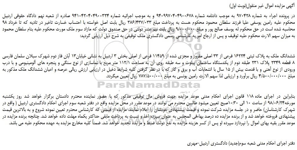 در پرونده اجراء به شماره 970428 به موجب دادنامه شماره 9409970404900678 و به موجب اجرائیه شماره 9410420404900324 صادره از شعبه نهم دادگاه حقوقی اردبیل محکوم علیه رامین یوسفی علیا فرزند سلطان محمود محکوم هست به پرداخت مبلغ 386/437/033 ریال بابت اصل خواسته با احتساب خسارت تاخیر در تادیه که تا خرداد 98 محاسبه شده است در حق محکوم له یوسف صالح پور و مبلغ 9/000/000 ریال بابت نیم عشر دولتی در حق صندوق دولت که مازاد سوم ملک مورث محکوم علیه بنام سلطان محمود به میزان سهم الارث محکوم علیه توقیف و پس از ارجاع امر به کارشناس رسمی دادگستری ملک توقیفی به شرح ذیل ارزیابی گردید: