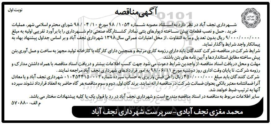 شهرداری نجف آباد در نظر دارد به استناد مصوبه شماره 1054/ 98 مورخ 98.4.10 شورای محترم اسلامی شهر، عملیات خرید، حمل و نصب قطعات پیش ساخته دیوارهای بتنی نمادار کشتارگاه صنعتی دام شهرداری را با برآورد تقریبی اولیه به مبلغ 9000.000.000 ریال بدون تعدیل و مابه التفاوت از محل اعتبارات عمرانی سال 98 شهرداری نجف آباد و براساس جداول پیشنهاد بها به پمانکار واجد شرایط واگذار نماید