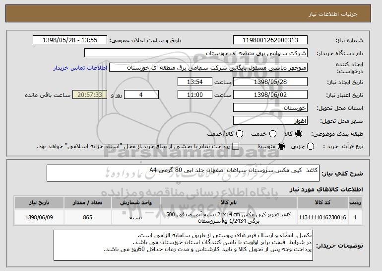 شرح کلی نیاز: کاغذ کپی مکس سروستان سپاهان اصفهان جلد ابی 80 گرمی A4