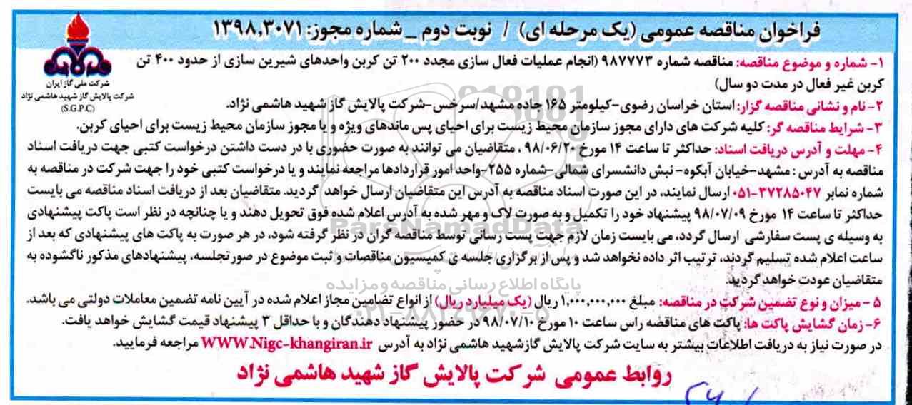 و موضوع مناقصه : مناقصه شماره 987773 انجام عملیات فعال سازی مجدد 200 تن کربن واحدهای شیرین سازی از حدود 400 تن کربن غیرفعال در مدت دو سال