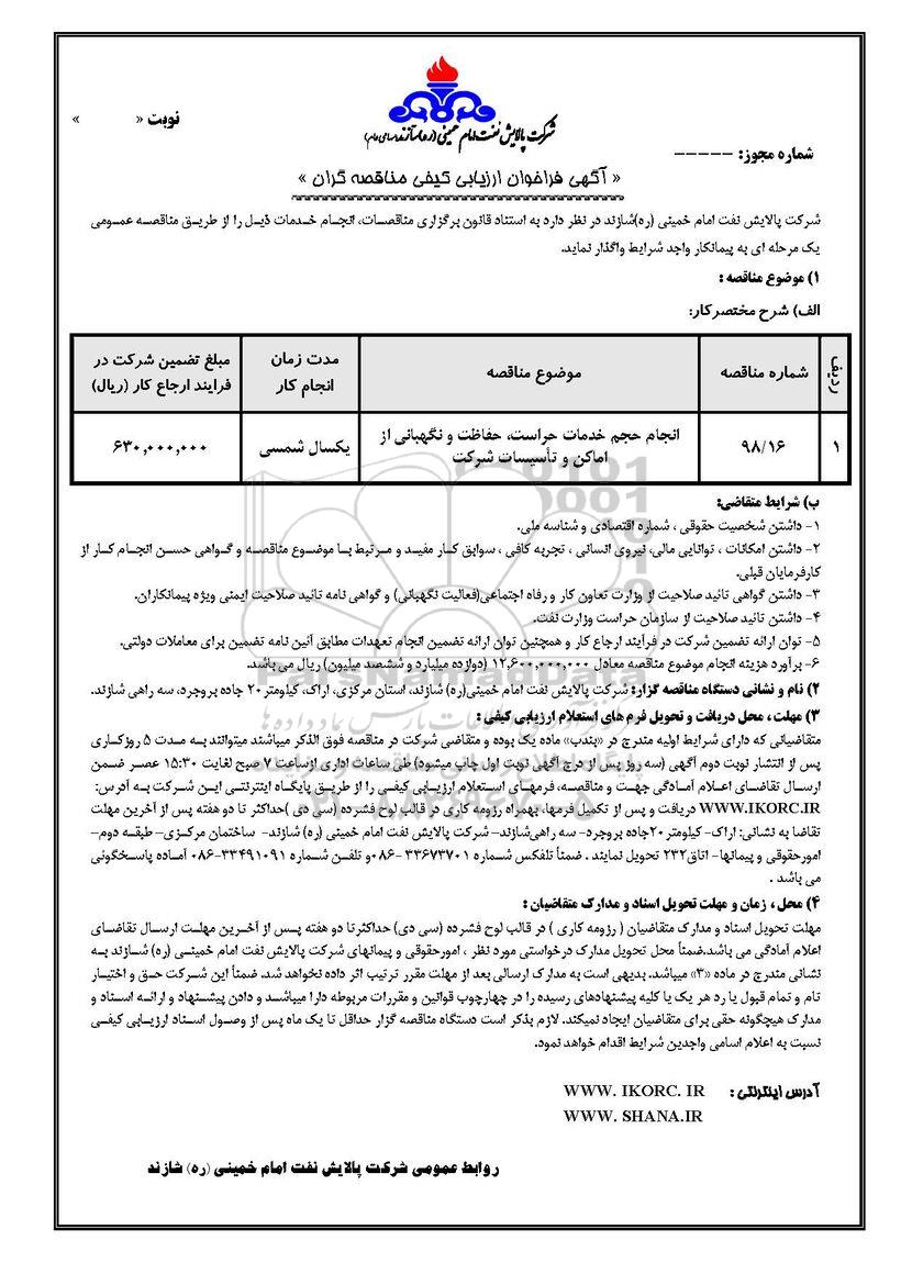 | 98/16 | انجام حجم خدمات حراست ، حفاظت و نگهبانی از اماکن و تاسیسات شرکت |