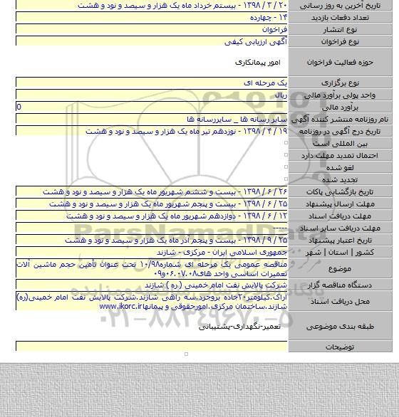 مناقصه عمومی یک مرحله ای شماره۱۰/۹۸ تحت عنوان تأمین حجم ماشین آلات تعمیرات اساسی واحد های۰۶.۰۷.۰۸و۰۹