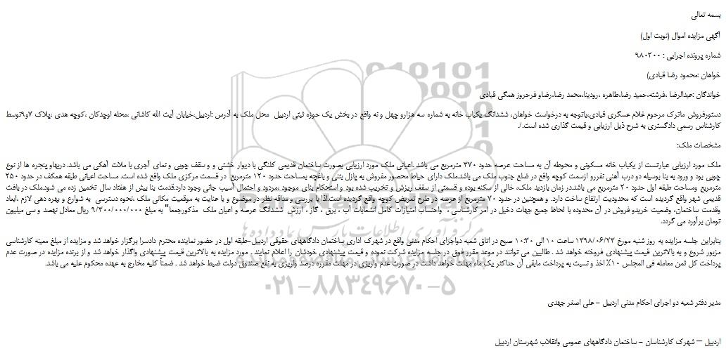 دستورفروش ماترک مرحوم غلام عسگری قبادی،باتوجه به درخواست خواهان، ششدانگ یکباب خانه به شماره سه هزارو چهل و نه واقع در بخش یک حوزه ثبتی اردبیل محل ملک به آدرس :اردبیل،خیابان آیت الله کاشانی ،محله اوچدکان ،کوچه هدی ،پلاک 7و9توسط کارشناس رسمی دادگستری به شرح ذیل ارزیابی و قیمت گذاری شده است./.