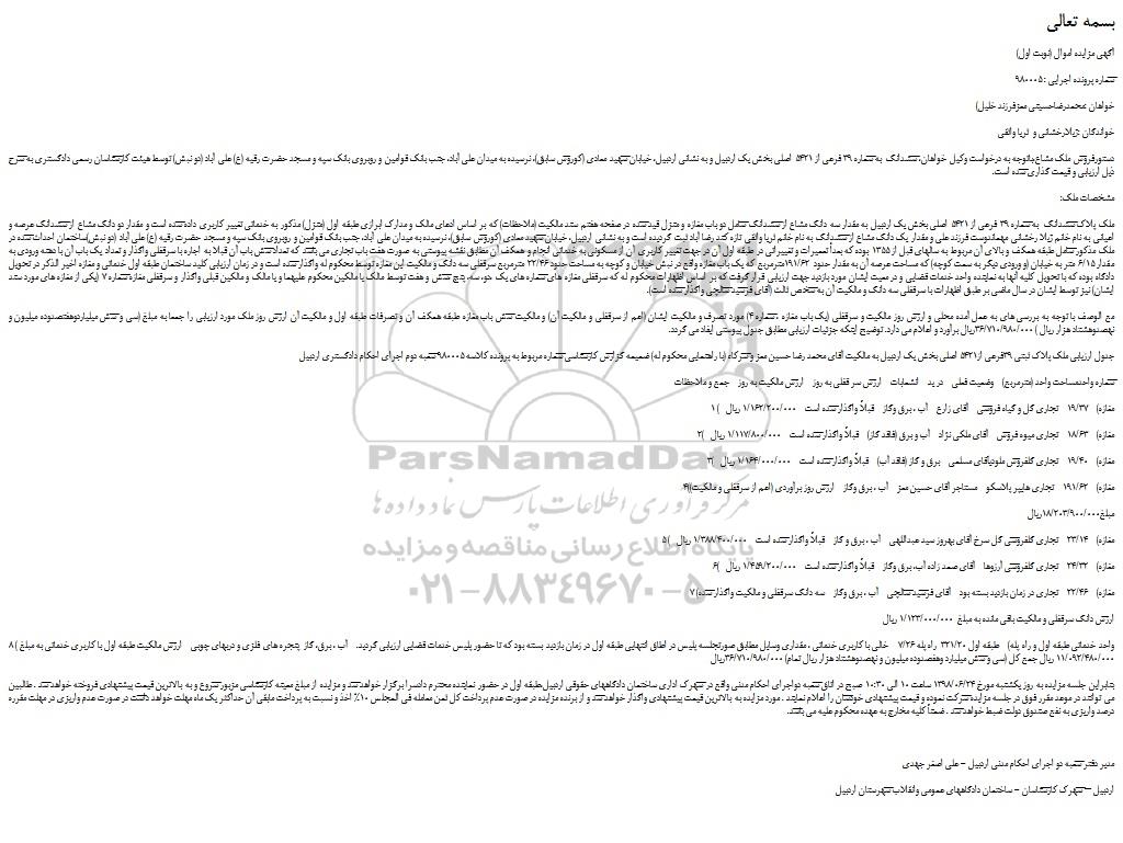 دستورفروش ملک مشاع،باتوجه به درخواست وکیل خواهان، ششدانگ به شماره ۳۹ فرعی از ۵۴۲۱ اصلی بخش یک اردبیل و به نشانی اردبیل، خیابان شهید معادی (کوروش سابق)، نرسیده به میدان علی آباد، جنب بانک قوامین و روبروی بانک سپه و مسجد حضرت رقیه (ع) علی آباد (دو نبش) توسط هیئت کارشناسان رسمی دادگستری به شرح ذیل ارزیابی و قیمت گذاری شده است.