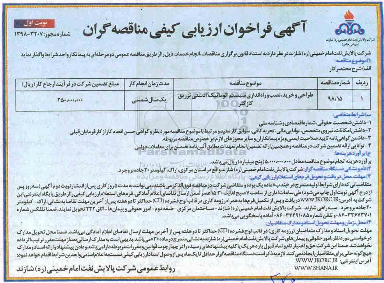 فراخوان ارزیابی کیفی طراحی و خرید ، نصب و راه اندازی, آگهی فراخوان ارزیابی کیفی, فراخوان ارزیابی کیفی طراحی و خرید ، نصب و راه اندازی