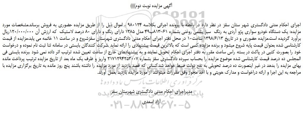 اجرای احکام مدنی دادگستری شهر ستان سقز در نظر دارد در رابطه با پرونده اجرائی بکلاسه 980124 ، اموال ذیل را از طریق مزایده حضوری به فروش برساند.مشخصات مورد مزایده: یک دستگاه خودرو سواری پژو آردی به رنگ سبز یشمی روغنی بشماره 61-813ب49 مدل 1385 دارای رنگ و دارای 80 درصد لاستیک که ارزش آن 120/000/000ریال برآورد گردیده است.مزایده حضوری و در تاریخ 1398/6/13 ساعت10 در محل دفتر اجرای احکام مدنی دادگستری شهرستان سقزشروع و در ساعت 11 خاتمه می یابد،مزایده از قیمت کارشناسی شده بعنوان قیمت پایه شروع میشود و برنده مزایده کسی است که بالاترین قیمت پیشنهادی را ارائه نماید .شرکت کنندگان بایستی در سامانه ثنا ثبت نام نموده و درخواست خود را بصورت کتبی در پاکت در بسته راس ساعت مقرر به دفتر اجرای احکام تحویل نمایند و به پیشنهادهای خارج از ساعت تعیین شده ترتیب اثر داده نمی شود .برنده بایستی فی المجلس ده درصد قیمت کارشناسی شده موضوع مزایده را بحساب سپرده دادگستری سقز بشماره 2171294253007 واریز و ظرف یک ماه بعد از تاریخ مزایده ترتیب پرداخت مانده بهای مزایده را بدهد در غیر اینصورت ده درصد تحویلی به نفع دولت ضبط خواهد شد.کسانی که قصد بازدید از مورد مزایده را داشته باشند پنج روز مانده به تاریخ برگزاری مزایده با مراجعه به این اجرا و ارائه دراخواست و مدارک هویتی و با اخذ مجوز وفق مقررات میتوانند از مورد مزایده بازدید بعمل آورند.