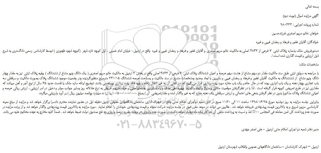 دستورفروش ملک بشماره پلاک ثبتی 7 فرعی از 4843 اصلی به مالکیت خانم مریم اصغری و آقایان غفور و فرهاد و رمضان غیبی و غیره واقع در اردبیل : خیابان امام خمینی ، اول کوچه تازه شهر (کوچه شهید ظهوری ) توسط کارشناس رسمی دادگستری به شرح ذیل ارزیابی و قیمت گذاری شده است./.