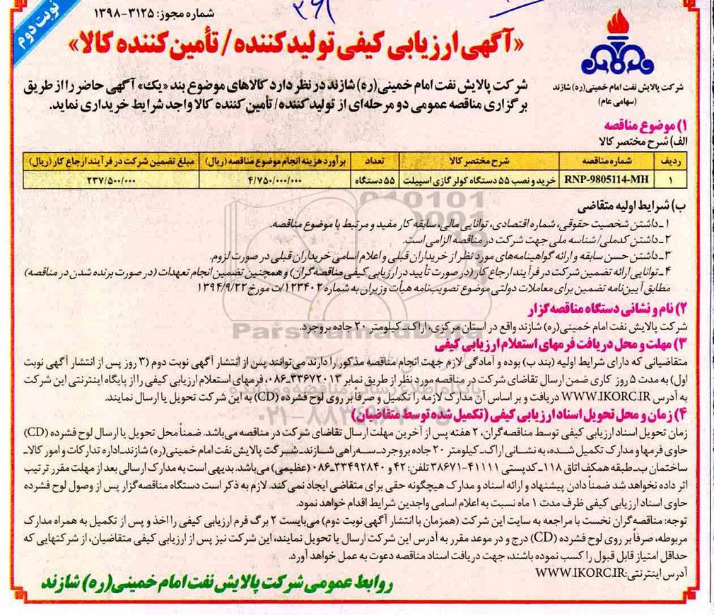 شرکت پالایش نفت امام خمینی (ره) شازند در نظر دارد کالاهای موضوع بند یک آگهی حاضر را از طریق برگزاری مناقصه عمومی دو مرحله ای از تولید کننده / تامین کننده کالا واجد شرایط خریداری و تامین نماید.