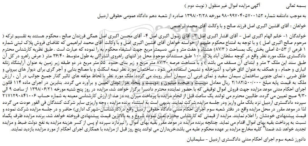 خواندگان 1- خانم الهام اکبری اصل - آقای افشار اکبری اصل 3- آقای رسول اکبری اصل 4- آقای محسن اکبری اصل همگی فرزندان صالح ، محکوم هستند به تقسیم ترکه ( مرحوم صالح اکبری اصل ) و با توجه به امتناع محکوم علیهم از خواسته خواهان آقای افشین اکبری اصل و با وکالت آقای محمد ابراهیمی که تقاضای فروش پلاک ثبتی شماره 1 فرعی از 5053 اصلی بخش یک بمساحت ( 87/3) هشتاد و هفت متر و سی دسیمتر مربع جهت استیفاء محکوم به را نموده که عبارت است . طبق نظریه کارشناس محترم دادگستری ملک مورد نظر واقع در کوچه سلطان آباد پلاک 100 طبق مستندات موجود محل در انتهای راهروی اشتراکی به طول متوسط 36/40 متر ( عرض راهرو در کل آن طبق سند این ملک 3 متر و ابتدای آن مسقف می باشد ) و با مساحت عرصه 87/30 متر مربع و زیر بنای حدود 55 متر مربع در دو طبقه زیر زمین به عنوان آرایشگاه زنانه انباری و حمام ، و همکف به عنوان اتاق خواب و آشپزخانه و نشیمن استفاده می شود ، ساختمان مورد نظر نیمه اسکلت و با مصالح بنایی و آجر گری برای دیوار های بیرونی و طاق ضربی ، نمای جنوبی ساختمان سیمان سفید و نمای غربی آن سیمان آستر رویت می گردد. ملک مورد نظر با لحاظ مولفه های تاثیر گذار جمیع جوانب در آن ، ارزش ملک به قیمت پایه مبلغ 2/182/500/000 ریال معادل دویست و هیجده میلیون و دویست و پنجاه هزار تومان تعیین و برآورد می گردد. بنابرین در اجرای ماده 114 قانون اجرای احکام مدنی موعد مزایده جهت فروش اموال توقیفی که با حضور نماینده محترم دادسرا برگزار خواهد شد، مزایده در روز پنج شنبه مورخه 1398/06/21 از ساعت 9 الی 9/30 صبح تعیین می گردد. طالبین محترم می توانند یک ساعت قبل از انجام مزایده با پرداخت میزان ده در صد از ارزش کارشناسی معینه به شماره حساب 2171290841006 سپرده دادگستری اردبیل نزد بانک ملی واریز ودر جلسه مزایده شرکت نمایند. بدیهی است به استثناء برنده مزایده ، وجه واریزی سایر شرکت کنندگان فی الفور عودت می گردد لذا در موعد مقرر در محل مزایده واقع در دفتر شعبه سوم اجرای احکام مدنی دادگاه حقوقی اردبیل واقع در(کارشناسان-شهرک اداری) حاضر و در جلسه مزایده شرکت نموده و قیمت پیشنهادی خودشان را اعلام نمایند. مزایده از قیمتی که کارشناس محترم تعین نموده شروع و به بالاترین قیمت پیشنهادی فروخته خواهد شد، برنده مزایده ظرف یکماه نسبت به پرداخت بقیه بهای اموال اقدام می نماید. چنانچه برنده مزایده در موعد مقرر بقیه بهای اموال را نپردازد سپرده او پس از کسر هزینه مزایده به نفع دولت ضبط و مزایده تجدید خواهد شد ضمنا" کلیه مخارج مزایده بر عهده محکوم علیه می باشد.خریداران می توانند پنج روز قبل از مزایده با همکاری اجرای احکام از مورد مزایده بازدید نمایند.