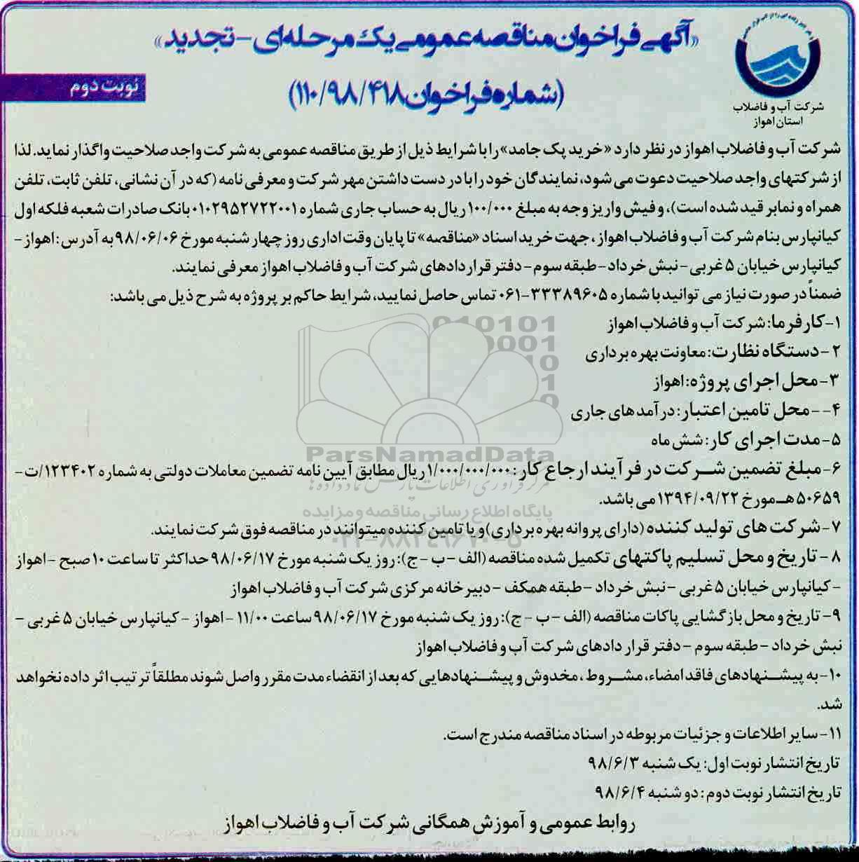 شرکت آب و فاضلاب اهواز در نظر دارد پروژه خرید پک جامد را با شرایط ذیل از طریق مناقصه عمومی به شرکت های واجد صلاحیت واگذار نماید. لذا از شرکتهای واجد صلاحیت دعوت می شود به نمایندگان خود با در دست داشتن مهر شرکت و معرفی نامه (که در آن نشانی، تلفن همراه و نمابر قید شده است) و فیش واریز به مبلغ 100.000 ریال به حساب جاری شماره 010292722001 بانک صادرات شعبه فلکه اول کیانپارس به نام شرکت آب و فاضلاب اهواز جهت خرید اسناد مناقصه تا پایان وقت اداری روز چهارشنبه مورخ 98.06.06 به آدرس اهواز - کیانپارس - خیابان 5 غربی - نبش خرداد - طبقه سوم - دفتر قراردادهای شرکت آب و فاضلاب اهواز معرفی نمایند. ضمنا در صورت نیاز می توانید با شماره 33389605 - 061 تماس حاصل نمایید شرایط حاکم بر پروژه به شرح ذیل می باشد