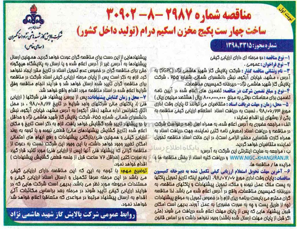 7- محل و زمان گشایش پیشنهادات: پس از بررسی پیشنهاد فنی شرکتها ارزیابی فنی پاکتهای مالی شرکتهای واجد شرایط در تاریخ 98.08.22 در محل اتاق کنفرانس اداره مشهد (دفتر آبکوه) به آدرس مشهد، خیابان آبکوه، نبش دانشسرای شمالی، شماره 255، شرکت پالایش گاز شهید هاشمی نژاد و حداقل با دو پیشنهاد تایید شده گشایش خواهد یافت لازم به ذکر است تا تاریخ و مکان اعلام شده تاریخ گشایش پیشنهادهای مالی قطعی نبوده و با توجه به روند ارزیابی فنی/ بازرگانی پیشنهادات و رفع ابهام های احتمالی امکان تغییر وجود خواهد داشت با این وجود این شرکت نسبت به دعوت از مناقصه گرانی که پیشنهاد فنی آنها پس از ارزیابی فنی مورد تایید قرار گیرد به صورت کتبی حداقل 72 ساعت قبل از جلسه قطعی گشایش پیشنهادات اقدام خواهد نمود