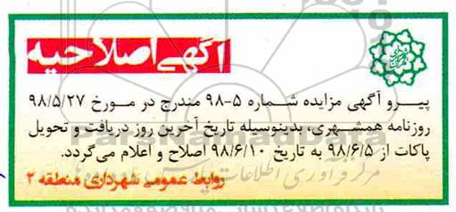 پیرو آگهی مزایده شماره 98-5 مندرج در مورخ 98.5.27 روزنامه همشهری، بدینوسیله از تاریخ آخرین روز دریافت و تحویل پاکات از 98.6.5 به تاریخ 98.6.10 اصلاح و اعلام می گردد