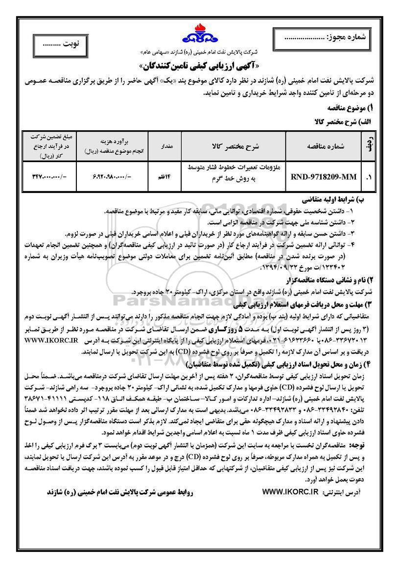 متقاضیانی که دارای شرایط اولیه (بند ب) بوده و آمادگی لازم جهت انجام مناقصه مذکور را دارند می توانند پس از انتشار آگهی نوبت دوم (3 روز پس از انتشار آگهی نوبت اول) به مدت 5 روز کاری ضمن ارسال تقاضای شرکت در مناقصه مورد نظر از طریق نمابر 33672013-086 یا 61623660 - 021 ، فرمهای استعلام ارزیابی کیفی را از پایگاه اینترنتی این شرکت به آدرس WWW.IKORC.IR دریافت و پر اساس آن مدارک لازمه را تکمیل و صرفا بر روی لوح فشرده (CD) به این شرکت تحویل یا ارسال نمایند.