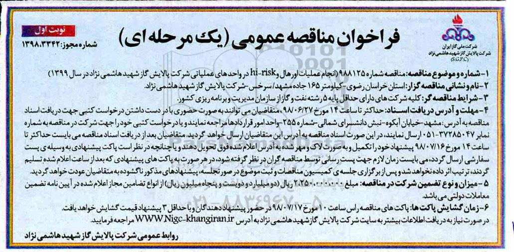 و موضوع مناقصه : مناقصه شماره 988125 انجام عملیات اورهال و hi-risk در واحدهای عملیاتی شرکت پالایش گاز شهید هاشمی نژاد در سال 1399