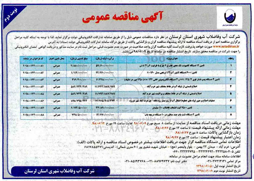 شرکت آب و فاضلاب شهری استان لرستان در نظر دارد مناقصات عمومی ذیل را ازطریق سامانه تدارکات الکترونیکی دولت برگزار نماید لذا با توجه به اینکه کلیه مراحل برگزاری مناقصه اعم از دریافت اسناد مناقصه تا ارائه پیشنهاد مناقصه گران و بازگشایی پاکات از طریق درگاه سامانه تدارکات الکترونیکی دولت (ستاد) به ادرس www.setadiran.ir صورت خواهد پذیرفت لازم است کلیه مناقصه گران واجد صلاحیت در صورت عدم عضویت قبلی در سایت مذکور و دریافت گواهی امضای الکترونیکی را جهت شرکت در مناقصه محقق سازند تاریخ انتشار مناقصه در سامانه تاریخ 98.06.9 می باشد