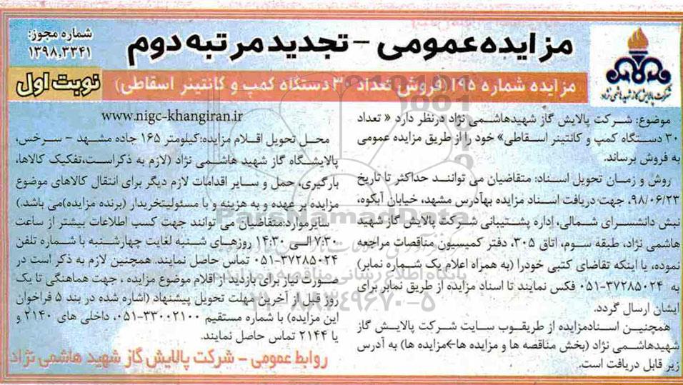 موضوع: شركت پالایش گاز شهید هاشمی نژاد در نظر دارد (تعداد 30 دستگاه كمپ و كانتینر اسقاطی) خود را از طریق مزایده عمومی به فروش برساند.