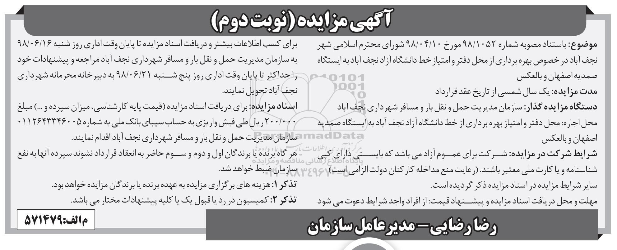 دستگاه مزایده گذار: سازمان مدیریت حمل و نقل بار و مسافر شهرداری نجف آباد