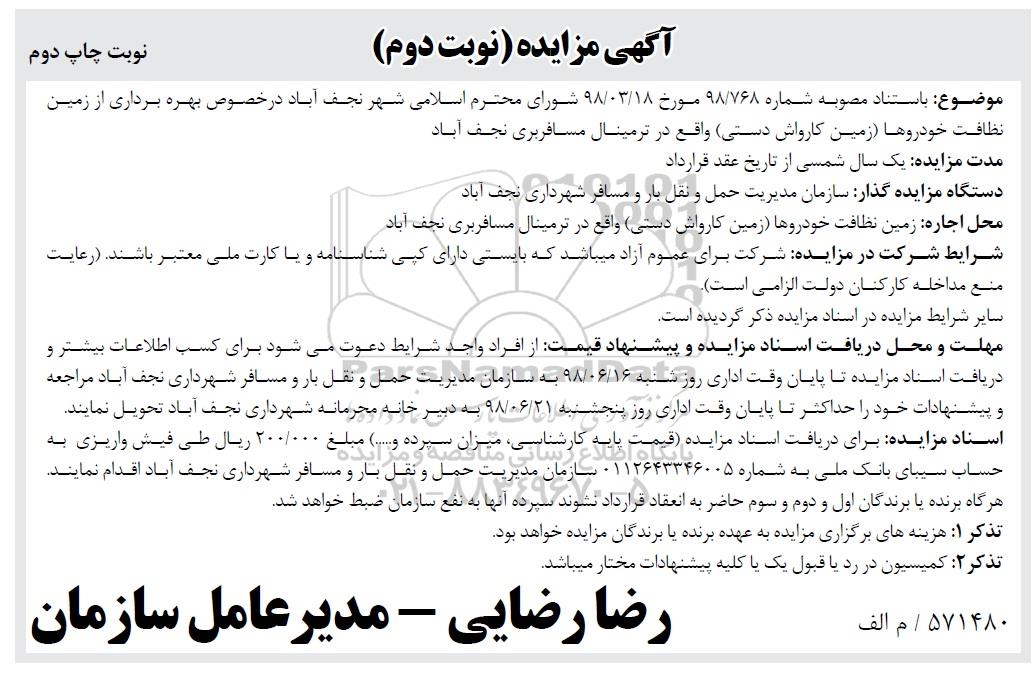 موضوع: به استناد مصوبه شماره 98/768 مورخ 98.03.18 شورای محترم اسلامی شهر نجف آباد در خصوص بهره برداری از زمین نظافت خودروها (زمین کارواش دستی) واقع در ترمینال مسافربری نجف آباد