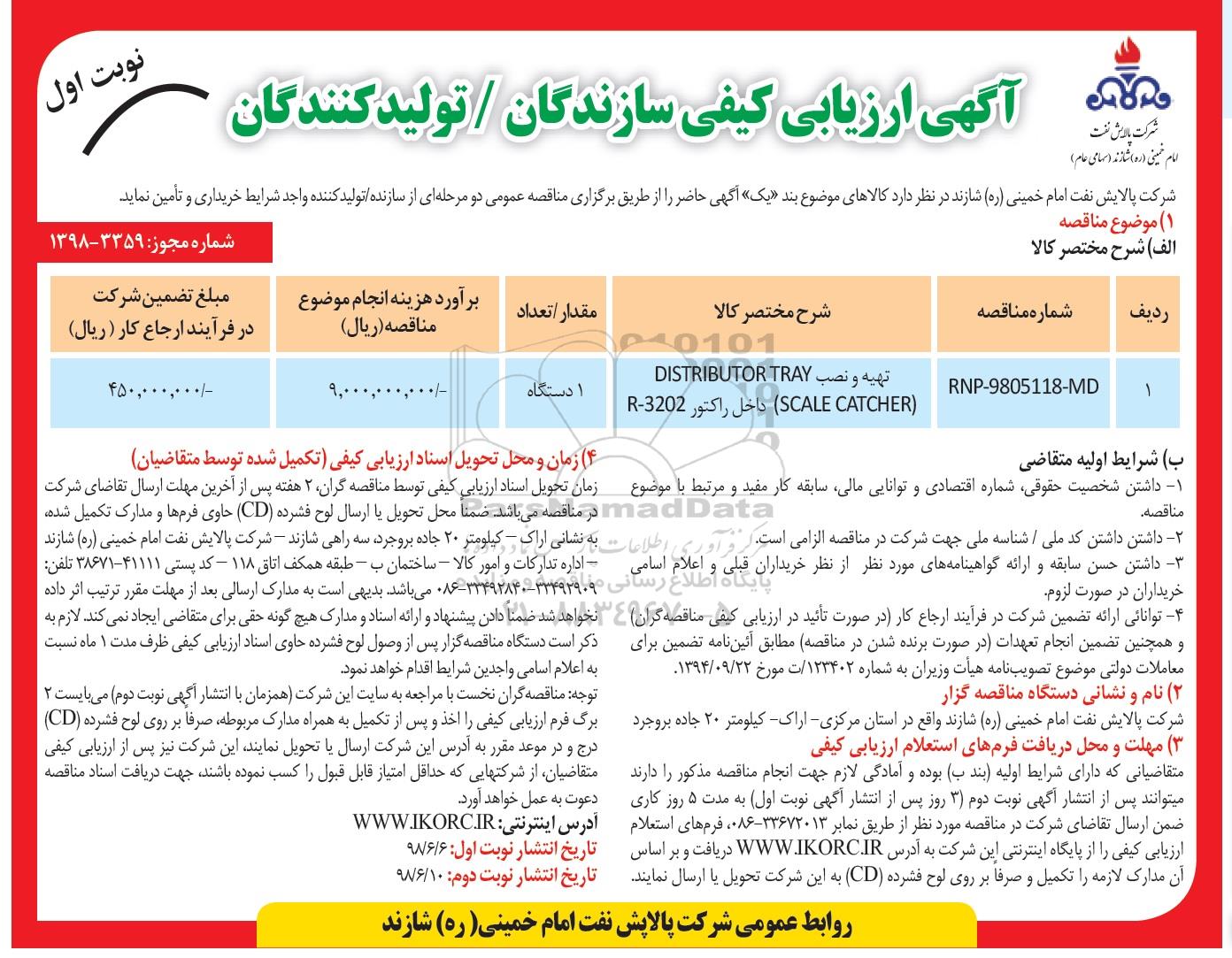 ارزیابی کیفی تهیه و نصب DISTRIBUTOR TRAY از کلیه افراد متخصص و شرکتها واجد شرایط دعوت به عمل میآید در مناقصه با کد خبرگزاری پارس نماد: 1862669 شرکت نمایند.