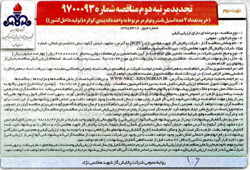 7- محل و زمان گشایش پیشنهادات: پس از بررسی پیشنهاد فنی شرکتها ارزیابی فنی پاکتهای مالی شرکتهای واجد شرایط در تاریخ 98.08.22 در محل اتاق کنفرانس اداره مشهد (دفتر آبکوه) به آدرس مشهد، خیابان آبکوه، نبش دانشسرای شمالی، شماره 255، شرکت پالایش گاز شهید هاشمی نژاد و حداقل با دو پیشنهاد تایید شده گشایش خواهد یافت لازم به ذکر است تا تاریخ و مکان اعلام شده تاریخ گشایش پیشنهادهای مالی قطعی نبوده و با توجه به روند ارزیابی فنی/ بازرگانی پیشنهادات و رفع ابهام های احتمالی امکان تغییر وجود خواهد داشت با این وجود این شرکت نسبت به دعوت از مناقصه گرانی که پیشنهاد فنی آنها پس از ارزیابی فنی مورد تایید قرار گیرد به صورت کتبی حداقل 72 ساعت قبل از جلسه قطعی گشایش پیشنهادات اقدام خواهد نمود