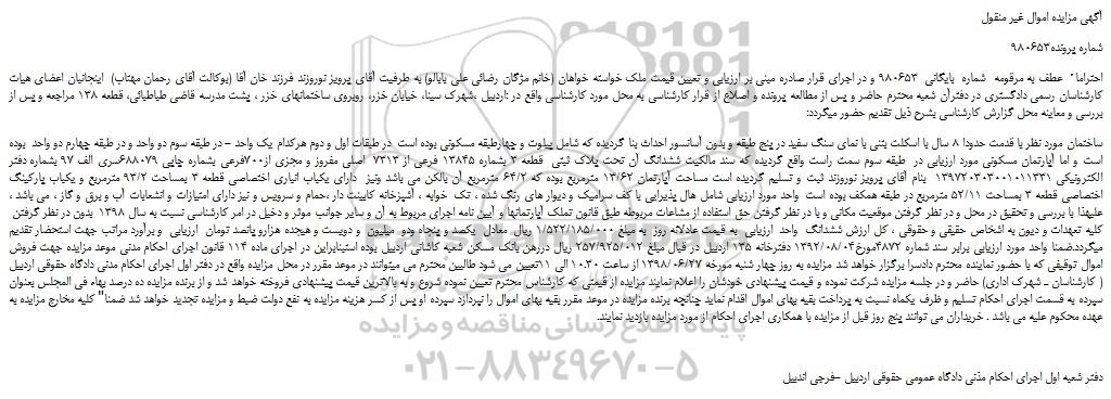 ساختمان مورد نظر با قدمت حدودا 8 سال با اسکلت بتنی با نمای سنگ سفید در پنج طبقه و بدون آسانسور احداث بنا گردیده که شامل پیلوت و چهارطبقه مسکونی بوده است در طبقات اول و دوم هرکدام یک واحد - در طبقه سوم دو واحد و در طبقه چهارم دو واحد بوده است و اما آپارتمان مسکونی مورد ارزیابی در طبقه سوم سمت راست واقع گردیده که سند مالکیت ششدانگ آن تحت پلاک ثبتی قطعه 3 بشماره 13845 فرعی از 7313 اصلی مفروز و مجزی از700فرعی بشماره چاپی 688079سری الف 97 بشماره دفتر الکترونیکی 139720303001011331 بنام آقای پرویز نوروزند ثبت و تسلیم گردیده است مساحت آپارتمان 13/62 مترمربع بوده که 64/2 مترمربع آن بالکن می باشد ونیز دارای یکباب انباری اختصاصی قطعه 3 بمساحت 93/2 مترمربع و یکباب پارکینگ اختصاصی قطعه 3 بمساحت 52/11 مترمربع در طبقه همکف بوده است واحد مورد ارزیابی شامل هال پذیرایی با کف سرامیک و دیوار های رنگ شده ، تک خوابه ، آشپزخانه کابینت دار ،حمام و سرویس و نیز دارای امتیازات و انشعابات آب و برق و گاز ، می باشد ، علیهذا با بررسی و تحقیق در محل و در نظر گرفتن موقعیت مکانی و با در نظر گرفتن حق استفاده از مشاعات مربوطه طبق قانون تملک آپارتمانها و آیین نامه اجرای مربوط به آن و سایر جوانب موثر و دخیل در امر کارشناسی نسبت به سال 1398 بدون در نظر گرفتن کلیه تعهدات و دیون به اشخاص حقیقی و حقوقی ، کل ارزش ششدانگ واحد ارزیابی به قیمت عادلانه روز به مبلغ 1/522/185/000 ریال معادل یکصد و پنجاه ودو میلیون و دویست و هیجده هزارو پانصد تومان ارزیابی و برآورد مراتب جهت استحضار تقدیم میگردد.ضمنا واحد مورد ارزیابی برابر سند شماره 4872مورخ1392/08/04 دفترخانه 135 اردبیل در قبال مبلغ 257/925/012 ریال دررهن بانک مسکن شعبه کاشانی اردبیل بوده استبنابراین در اجرای ماده 114 قانون اجرای احکام مدنی موعد مزایده جهت فروش اموال توقیفی که با حضور نماینده محترم دادسرا برگزار خواهد شد مزایده به روز چهار شنبه مورخه 1398/06/27 از ساعت 10.30 الی 11تعیین می شود طالبین محترم می میتوانند در موعد مقرر در محل مزایده واقع در دفتر اول اجرای احکام مدنی دادگاه حقوقی اردبیل ( کارشناسان ـ شهرک اداری) حاضر و در جلسه مزایده شرکت نموده و قیمت پیشنهادی خودشان را اعلام نمایند مزایده از قیمتی که کارشناس محترم تعیین نموده شروع و به بالاترین قیمت پیشنهادی فروخته خواهد شد و از برنده مزایده ده درصد بهاء فی المجلس بعنوان سپرده به قسمت اجرای احکام تسلیم و ظرف یکماه نسبت به پرداخت بقیه بهای اموال اقدام نماید چنانچه برنده مزایده در موعد مقرر بقیه بهای اموال را نپردازد سپرده او پس از کسر هزینه مزایده به نفع دولت ضبط و مزایده تجدید خواهد شد ضمنا" کلیه مخارج مزایده به عهده محکوم علیه می باشد . خریداران می توانند پنج روز قبل از مزایده با همکاری اجرای احکام از مورد مزایده بازدید نمایند.
