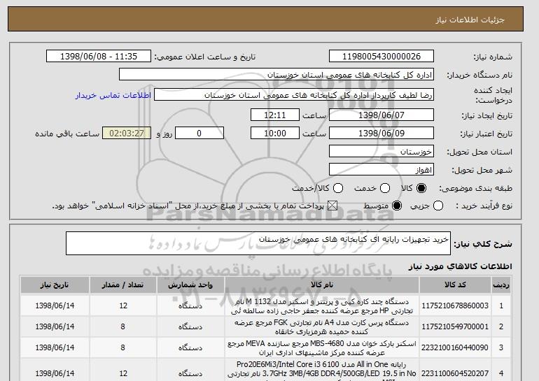 شرح کلی نیاز: خرید تجهیزات رایانه ای کتابخانه های عمومی خوزستان