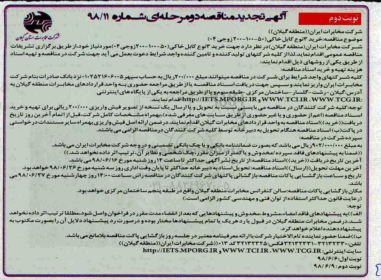 شرکت مخابرات ایران منطقه گیلان در نظر دارد جهت خرید 3 نوع کابل خاکی 50-100-200 زوجی 04 مورد نیاز خود از طریق برگزاری تشریفات مناقصه عمومی اقدام نماید . لذا از کلیه شرکتهای تولیدکننده و تامین کننده واجد شرایط دعوت به عمل می آید جهت شرکت در مناقصه و تهیه اسناد از طریق یکی از روشهای ذیل اقدام نمایند