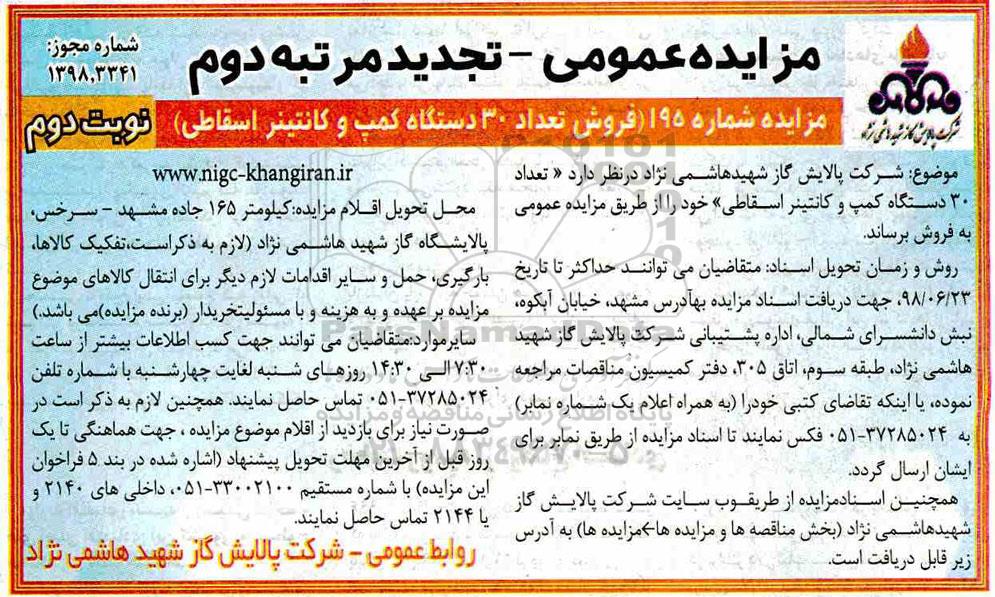 موضوع: شركت پالایش گاز شهید هاشمی نژاد در نظر دارد (تعداد 30 دستگاه كمپ و كانتینر اسقاطی) خود را از طریق مزایده عمومی به فروش برساند.