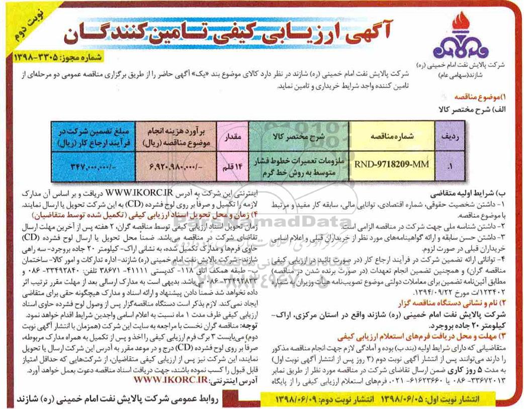 توجه: مناقصه گران نخست با مراجعه به سایت این شرکت (همزمان با انتشار آگهی نوبت دوم) می بایست 3 برگ فرم ارزیابی کیفی را اخذ و پس از تکمیل به همراه مدارک مربوطه، صرفا بر روی لوح فشرده (CD) درج و در موعد مقرر به آدرس این شرکت ارسال با تحویل نمایند این شرکت نیز پس از ارزیابی کیفی متقاقیان، از شرکتهایی که حداقل امتیاز قابل قبول را کسب نموده باشند، جهت دریافت اسناد مناقصه دعوت بعمل خواهد آورد. آدرس اینترنتی www.ikorc.ir