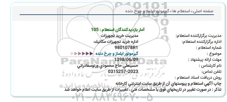 اداره برگزارکننده استعلام: اداره خرید تجهیزات مكانیک