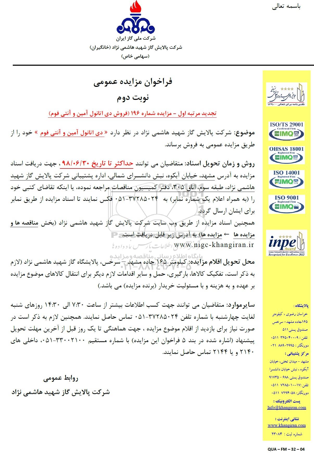 موضوع: شرکت پالایش گاز شهید هاشمی نژاد در نظر دارد دی اتانول آمین و آنتی فوم خود را از طریق مزایده عمومی به فروش برساند