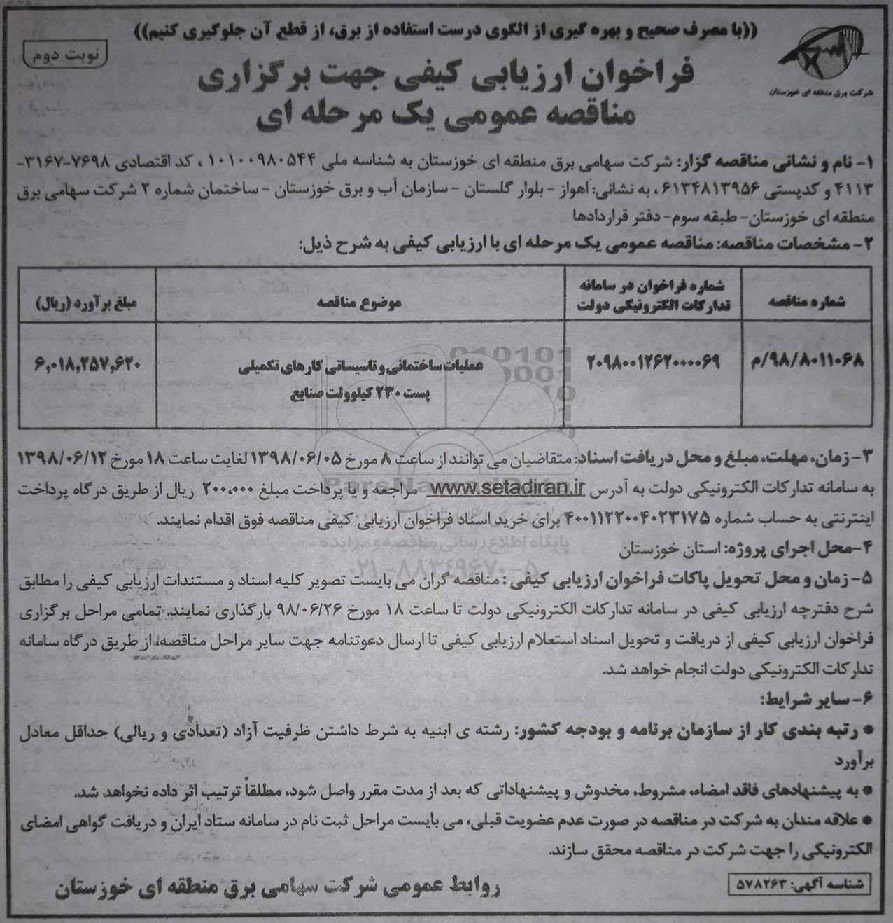 | 98/8011068/م | 2098001262000069 | عملیات ساختمانی و تاسیساتی کارهای تکمیلی پست 230 کیلوولت صنایع | 6.018.257.620 |