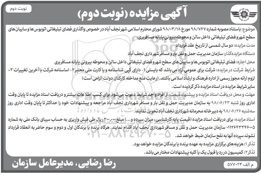 موضوع: به استناد مصوبه شماره 98/767 مورخ 98.3.18 شورای محترم اسلام شهر نجف آباد در خصوص واگذاری فضای تبلیغاتی اتوبوس ها و سایبان های سطح شهر و فضای تبلیغاتی داخل سالن و محوطه بیرونی پایانه مسافربری