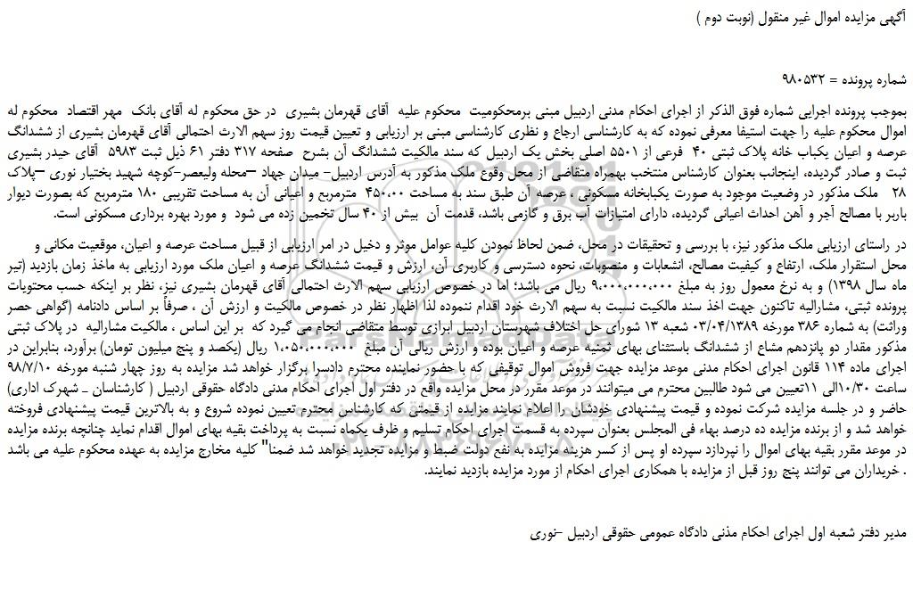 در راستای ارزیابی ملک مذکور نیز، با بررسی و تحقیقات در محل، ضمن لحاظ نمودن کلیه عوامل موثر و دخیل در امر ارزیابی از قبیل مساحت عرصه و اعیان، موقعیت مکانی و محل استقرار ملک، ارتفاع و کیفیت مصالح، انشعابات و منصوبات، نحوه دسترسی و کاربری آن، ارزش و قیمت ششدانگ عرصه و اعیان ملک مورد ارزیابی به ماخذ زمان بازدید (تیر ماه سال 1398) و به نرخ معمول روز به مبلغ 9،000،000،000 ریال می باشد؛ اما در خصوص ارزیابی سهم الارث احتمالی آقای قهرمان بشیری نیز، نظر بر اینکه حسب محتویات پرونده ثبتی، مشارالیه تاکنون جهت اخذ سند مالکیت نسبت به سهم الارث خود اقدام ننموده لذا اظهار نظر در خصوص مالکیت و ارزش آن ، صرفاً بر اساس دادنامه (گواهی حصر وراثت) به شماره 386 مورخه 03/04/1389 شعبه 13 شورای حل اختلاف شهرستان اردبیل ابرازی توسط متقاضی انجام می گیرد که بر این اساس ، مالکیت مشارالیه در پلاک ثبتی مذکور مقدار دو پانزدهم مشاع از ششدانگ باستثنای بهای ثمنیه عرصه و اعیان بوده و ارزش ریالی آن مبلغ 1،050،000،000 ریال (یکصد و پنج میلیون تومان) برآورد، بنابراین در اجرای ماده 114 قانون اجرای احکام مدنی موعد مزایده جهت فروش اموال توقیفی که با حضور نماینده محترم دادسرا برگزار خواهد شد مزایده به روز چهار شنبه مورخه 98/7/10 ساعت 10/30الی 11تعیین می شود طالبین محترم می میتوانند در موعد مقرر در محل مزایده واقع در دفتر اول اجرای احکام مدنی دادگاه حقوقی اردبیل ( کارشناسان ـ شهرک اداری) حاضر و در جلسه مزایده شرکت نموده و قیمت پیشنهادی خودشان را اعلام نمایند مزایده از قیمتی که کارشناس محترم تعیین نموده شروع و به بالاترین قیمت پیشنهادی فروخته خواهد شد و از برنده مزایده ده درصد بهاء فی المجلس بعنوان سپرده به قسمت اجرای احکام تسلیم و ظرف یکماه نسبت به پرداخت بقیه بهای اموال اقدام نماید چنانچه برنده مزایده در موعد مقرر بقیه بهای اموال را نپردازد سپرده او پس از کسر هزینه مزایده به نفع دولت ضبط و مزایده تجدید خواهد شد ضمنا" کلیه مخارج مزایده به عهده محکوم علیه می باشد . خریداران می توانند پنج روز قبل از مزایده با همکاری اجرای احکام از مورد مزایده بازدید نمایند.