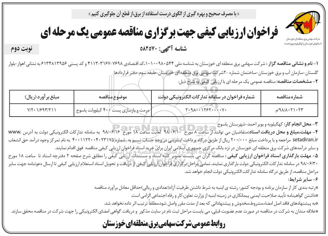 98/8021023/م 2098001262000070 مرمت و بازسازی پست 400 کیلوولت یاسوج 7.201.693.211