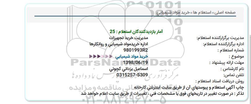 اداره برگزارکننده استعلام: اداره خرید مواد شیمیایی و روانکارها