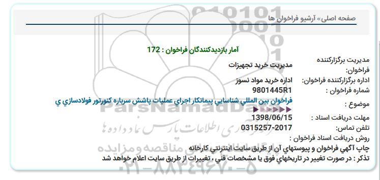 فراخوان بین المللی شناسایی پیمانکار اجرای عملیات پاشش سرباره از کلیه افراد متخصص و شرکتها واجد شرایط دعوت به عمل میآید در مناقصه با کد خبرگزاری پارس نماد: 1874992 شرکت نمایند.