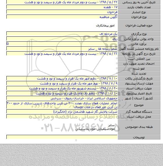 مناقصه, انجام عملیات فعال سازی مجدد ۲۰۰ تن کربن واحدهای شیرین سازی از حدود ۴۰۰ تن کربن غیر فعال در مدت دوسال, انجام عملیات فعال سازی مجدد ۲۰۰ تن کربن واحدهای شیرین سازی از حدود ۴۰۰ تن کربن غیر فعال در مدت دوسال