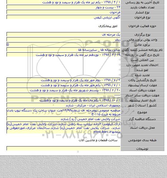 مناقصه عمومی دومرحله ای شماره۱۲/۹۸تحت عنوان ساخت یک دستگاه تیوپ باندل مربوط به مبدل E-۱۱۵