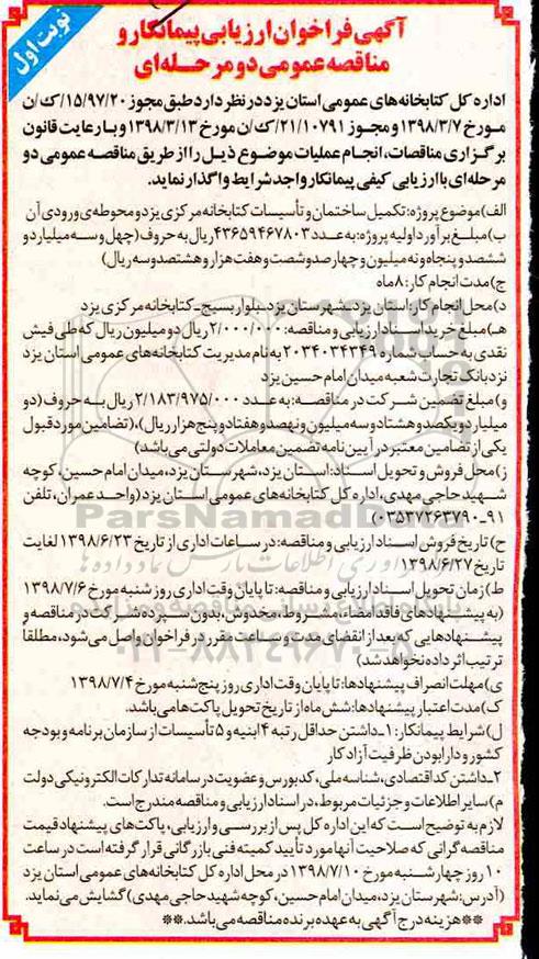 اداره کل کتابخانه های عمومی استان یزد برگزاری مناقصات انجام عملیات موضوع ذیل را ازطریق مناقصه عمومی دومرحله ای با ارزیابی کیفی پیمانکار واجد شرایط واگذار نماید