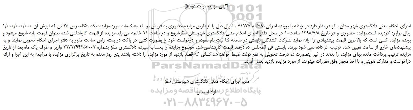 اجرای احکام مدنی دادگستری شهر ستان سقز در نظر دارد در رابطه با پرونده اجرائی بکلاسه 71175 ، اموال ذیل را از طریق مزایده حضوری به فروش برساند.مشخصات مورد مزایده: یکدستگاه پرس 25 تن که ارزش آن 1/000/000/000 ریال برآورد گردیده است.مزایده حضوری و در تاریخ 1398/7/8 ساعت10 در محل دفتر اجرای احکام مدنی دادگستری شهرستان سقزشروع و در ساعت 11 خاتمه می یابد،مزایده از قیمت کارشناسی شده بعنوان قیمت پایه شروع میشود و برنده مزایده کسی است که بالاترین قیمت پیشنهادی را ارائه نماید .شرکت کنندگان بایستی در سامانه ثنا ثبت نام نموده و درخواست خود را بصورت کتبی در پاکت در بسته راس ساعت مقرر به دفتر اجرای احکام تحویل نمایند و به پیشنهادهای خارج از ساعت تعیین شده ترتیب اثر داده نمی شود .برنده بایستی فی المجلس ده درصد قیمت کارشناسی شده موضوع مزایده را بحساب سپرده دادگستری سقز بشماره 2171294253007 واریز و ظرف یک ماه بعد از تاریخ مزایده ترتیب پرداخت مانده بهای مزایده را بدهد در غیر اینصورت ده درصد تحویلی به نفع دولت ضبط خواهد شد.کسانی که قصد بازدید از مورد مزایده را داشته باشند پنج روز مانده به تاریخ برگزاری مزایده با مراجعه به این اجرا و ارائه دراخواست و مدارک هویتی و با اخذ مجوز وفق مقررات میتوانند از مورد مزایده بازدید بعمل آورند.
