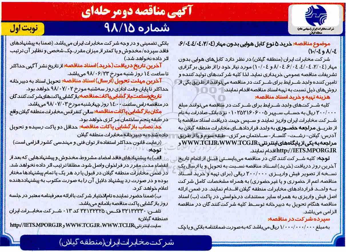 شرکت مخابرات ایران منطقه گیلان در نظر دارد کابل هوایی بدون مهار 2.04 ، 4.04 ، 6.04 ، 8.04 و 10.04 مورد نیاز خود از طریق برگزاری تشریفات مناقصه عمومی خریداری نماید . لذا از کلیه شرکتهای تولیدکننده و تامین کننده واجد شرایط دعوت به عمل می آید جهت شرکت در مناقصه و تهیه اسناد از طریق یکی از روشهای ذیل اقدام نمایند