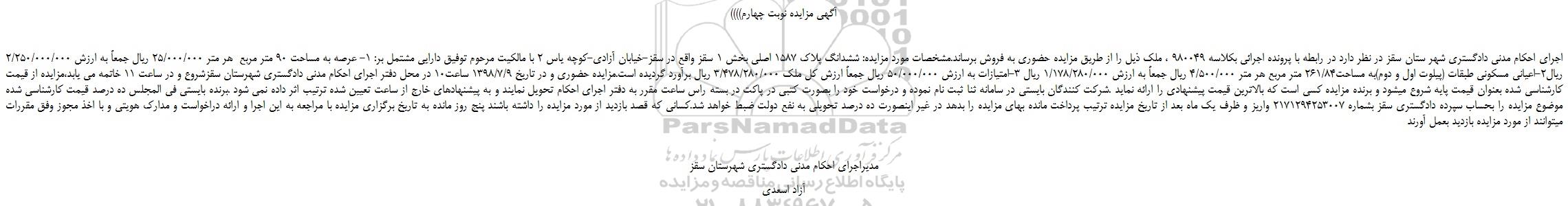 اجرای احکام مدنی دادگستری شهر ستان سقز در نظر دارد در رابطه با پرونده اجرائی بکلاسه 980049 ، ملک ذیل را از طریق مزایده حضوری به فروش برساند.مشخصات مورد مزایده: ششدانگ پلاک 1587 اصلی بخش 1 سقز واقع در سقز-خیابان آزادی-کوچه یاس 2 با مالکیت مرحوم توفیق دارایی مشتمل بر: 1- عرصه به مساحت 90 متر مربع هر متر 25/000/000 ریال جمعاً به ارزش 2/250/000/000 ریال2-اعیانی مسکونی طبقات (پیلوت اول و دوم)به مساحت261/84 متر مربع هر متر 4/500/000 ریال جمعاً به ارزش 1/178/280/000 ریال 3-امتیازات به ارزش 50/000/000 ریال جمعاً ارزش کل ملک 3/478/280/000 ریال برآورد گردیده است.مزایده حضوری و در تاریخ 1398/7/9 ساعت10 در محل دفتر اجرای احکام مدنی دادگستری شهرستان سقزشروع و در ساعت 11 خاتمه می یابد،مزایده از قیمت کارشناسی شده بعنوان قیمت پایه شروع میشود و برنده مزایده کسی است که بالاترین قیمت پیشنهادی را ارائه نماید .شرکت کنندگان بایستی در سامانه ثنا ثبت نام نموده و درخواست خود را بصورت کتبی در پاکت در بسته راس ساعت مقرر به دفتر اجرای احکام تحویل نمایند و به پیشنهادهای خارج از ساعت تعیین شده ترتیب اثر داده نمی شود .برنده بایستی فی المجلس ده درصد قیمت کارشناسی شده موضوع مزایده را بحساب سپرده دادگستری سقز بشماره 2171294253007 واریز و ظرف یک ماه بعد از تاریخ مزایده ترتیب پرداخت مانده بهای مزایده را بدهد در غیر اینصورت ده درصد تحویلی به نفع دولت ضبط خواهد شد.کسانی که قصد بازدید از مورد مزایده را داشته باشند پنج روز مانده به تاریخ برگزاری مزایده با مراجعه به این اجرا و ارائه دراخواست و مدارک هویتی و با اخذ مجوز وفق مقررات میتوانند از مورد مزایده بازدید بعمل آورند