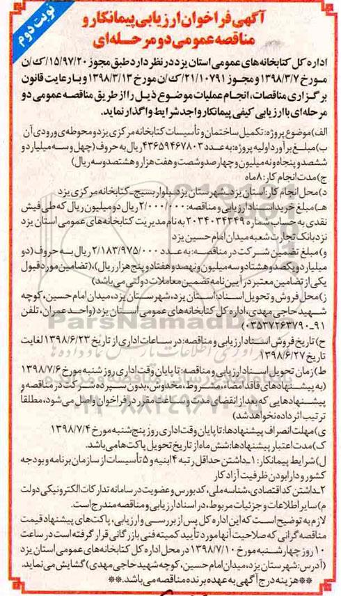 اداره کل کتابخانه های عمومی استان یزد برگزاری مناقصات انجام عملیات موضوع ذیل را ازطریق مناقصه عمومی دومرحله ای با ارزیابی کیفی پیمانکار واجد شرایط واگذار نماید