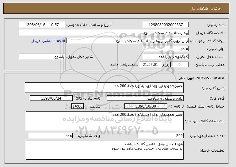 شرح کلی نیاز: چمپر همودیفایر نوزاد (وینتیلاتور) تعداد200 عدد-