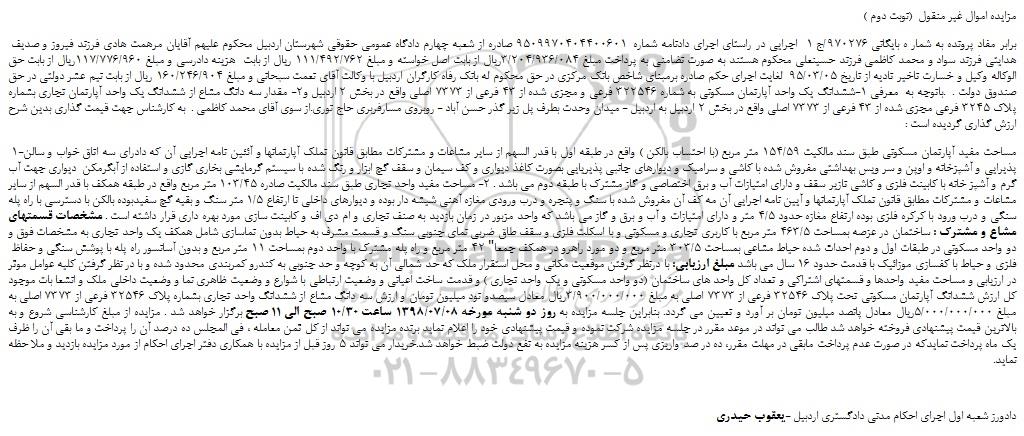 برابر مفاد پرونده به شمار ه بایگانی 970276/ج 1 اجرایی در راستای اجرای دادنامه شماره 9509970404400601 صادره از شعبه چهارم دادگاه عمومی حقوقی شهرستان اردبیل محکوم علیهم آقایان مرهمت هادی فرزند فیروز و صدیف هدایتی فرزند سواد و محمد کاظمی فرزند حسینعلی محکوم هستند به صورت تضامنی به پرداخت مبلغ 3/204/936/084ریال از بابت اصل خواسته و مبلغ 111/492/762 ریال از بابت هزینه دادرسی و مبلغ 117/776/960ریال از بابت حق الوکاله وکیل و خسارت تاخیر تادیه از تاریخ 95/03/05 لغایت اجرای حکم صادره برمبنای شاخص بانک مرکزی در حق محکوم له بانک رفاه کارگران اردبیل با وکالت آقای نعمت سبحانی و مبلغ 160/246/904 ریال از بابت نیم عشر دولتی در حق صندوق دولت . .باتوجه به معرفی 1-ششدانگ یک واحد آپارتمان مسکونی به شماره 322546 فرعی و مجزی شده از 43 فرعی از 7373 اصلی واقع در بخش 2 اردبیل و2- مقدار سه دانگ مشاع از ششدانگ یک واحد آپارتمان تجاری بشماره پلاک 3245 فرعی مجزی شده از 43 فرعی از 7373 اصلی واقع در بخش 2 اردبیل به اردبیل - میدان وحدت بطرف پل زیر گذر حسن آباد - روبروی مسارفربری حاج نوری.از سوی آقای محمد کاظمی . به کارشناس جهت قیمت گذاری بدین شرح ارزش گذاری گردیده است :